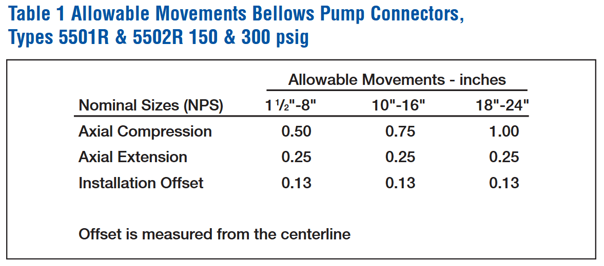 Bellows pump connectors are designed to connect rigid piping to mechanical equipment that has thermal growth or mechanical movement. Although limit rods are an integral part of the design to prevent over extension or compression, these rods should be loose for full benefit. The rigid anchor shown in the illustration must be capable of reacting the pressure thrust and the spring force of the bellows.