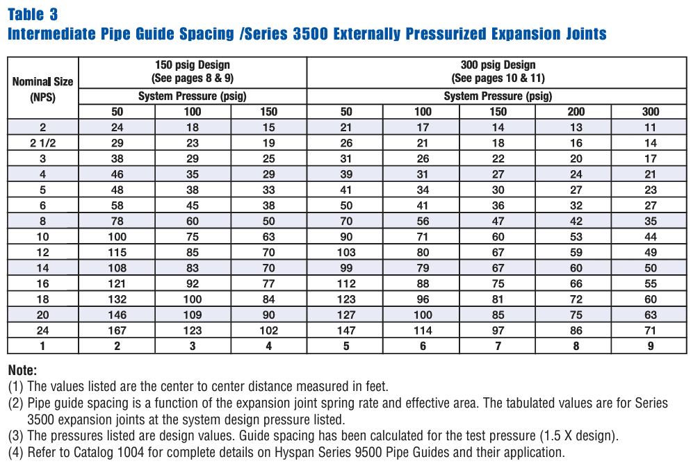The maximum alignment guide spacing in the intermediate portion of the run is a function of the pipe/tube properties (modulus of elasticity and moment of inertia), the design pressure, and the expansion joint effective area and spring force. Refer to the Applications section of Hyspan expansion joint catalogs for the individual product guiding requirements.